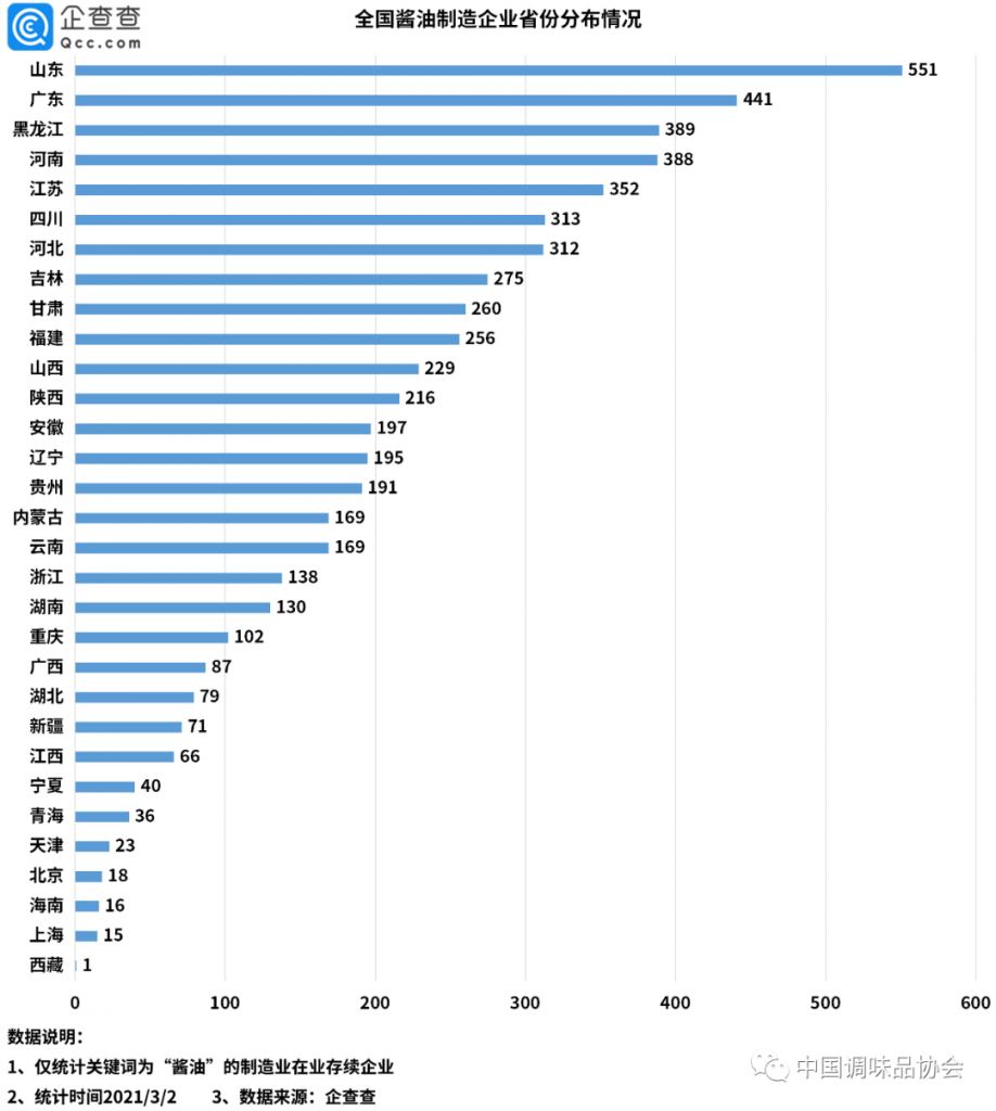 ? ? ? 醬油制造企業(yè)省份分布上,山東省擁有的醬油制造企業(yè)最多,達551家,廣東、黑龍江次之。