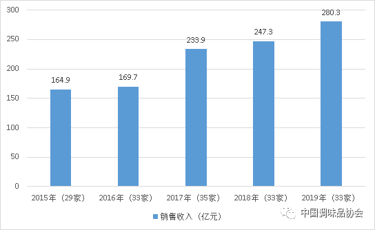 ? ? ? 2015-2019年百強企業(yè)醬油產(chǎn)業(yè)銷售收入分別為:164.9億元、169.7億元、233.9億元、247.3億元、280.3億元。