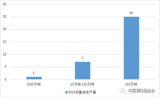 ? ? ? 中國著名品牌企業(yè)100強數(shù)據(jù)統(tǒng)計顯示,2019年百強企業(yè)中醬油產(chǎn)量分布呈現(xiàn)金字塔狀。年產(chǎn)量超過100萬噸有1家,10-100萬噸有7家,10萬噸以下有25家。