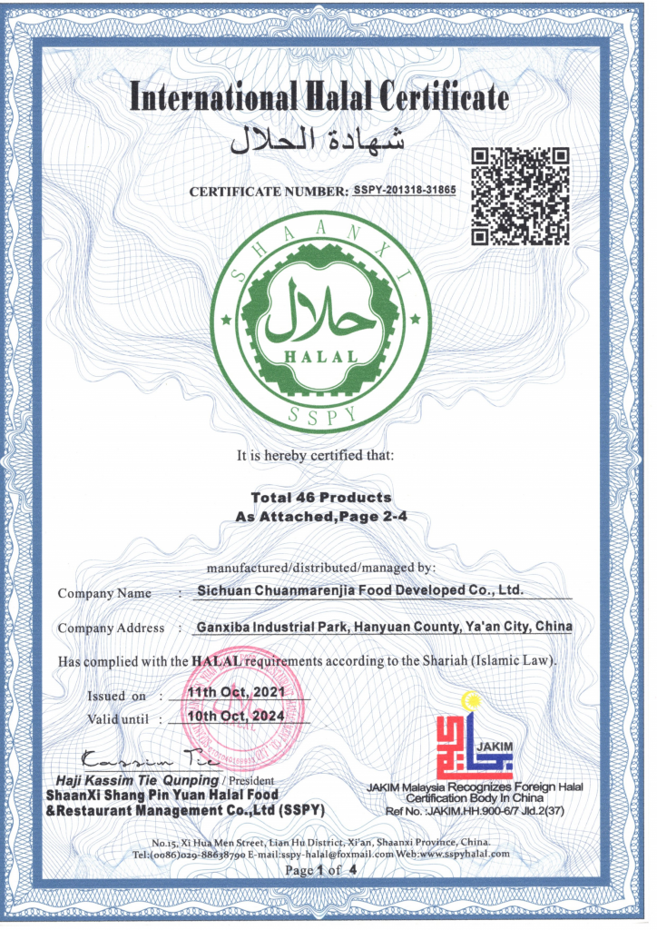 ? ? ? ?清真認(rèn)證,即符合穆斯林生活習(xí)慣和需求的食品、藥品、化妝品以及食品、藥品、化妝品添加劑。為響應(yīng)國(guó)家“一帶一路”倡議,滿足沿線國(guó)家對(duì)清真產(chǎn)品不斷擴(kuò)大的市場(chǎng)需求,川麻人家抓住機(jī)遇,依托母公司丁點(diǎn)兒股份專(zhuān)注川菜標(biāo)準(zhǔn)化調(diào)味品22年的生產(chǎn)技術(shù)及產(chǎn)品研發(fā)優(yōu)勢(shì),專(zhuān)注于漢源花椒及清真復(fù)合調(diào)味品研發(fā)、生產(chǎn)、加工,致力于清真美食的創(chuàng)新與推廣,促進(jìn)國(guó)際清真飲食文化交流和發(fā)展。