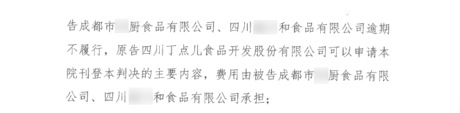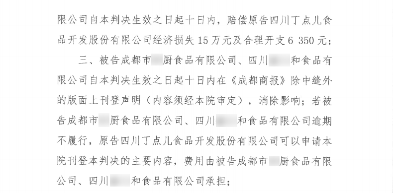 ? ? ? ?2020年11月30日,成都市中級(jí)人民法院一審判決丁點(diǎn)兒股份訴成都市某廚食品有限公司、四川某和食品有限公司不正當(dāng)競(jìng)爭(zhēng)維權(quán)案勝訴。