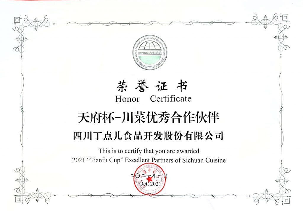 ? ? ? ?10月18-20日,由成都市郫都區(qū)人民政府、世界中餐業(yè)聯(lián)合會共同主辦的第四屆世界川菜大會在成都市郫都區(qū)隆重召開,丁點兒股份攜企業(yè)明星產(chǎn)品在會場亮相,并在2021“天府杯”世界川菜頒獎大會中獲得“‘天府杯’川菜優(yōu)秀合作伙伴”稱號。