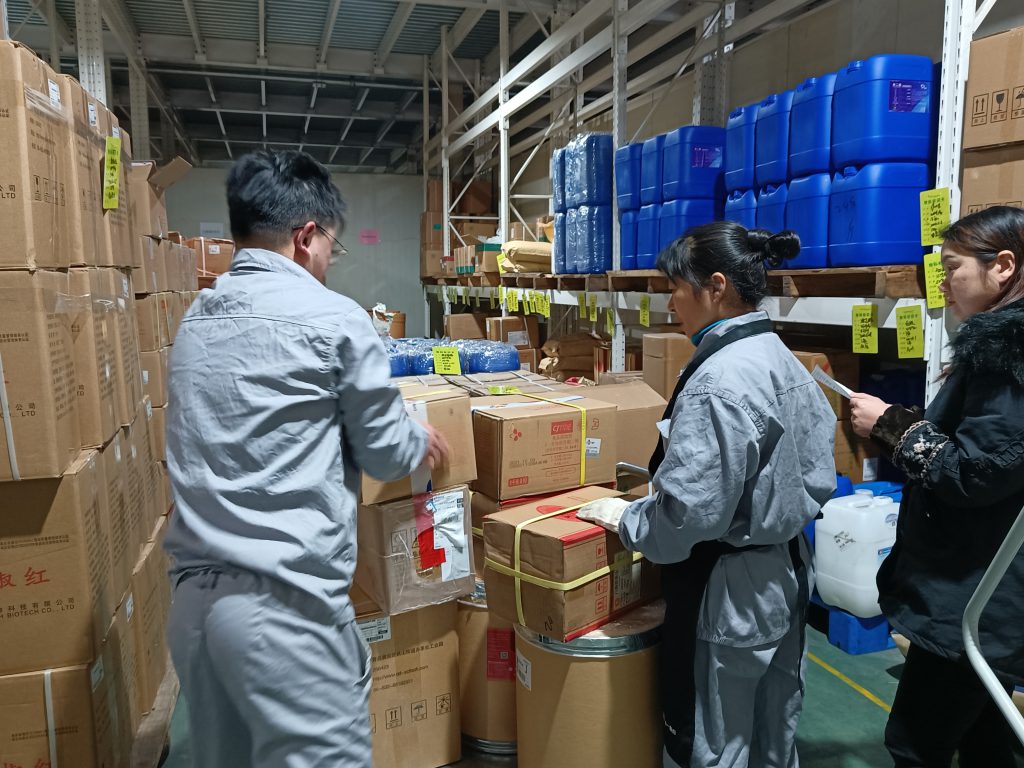 技術(shù)管理配料員正在庫房領(lǐng)取原料