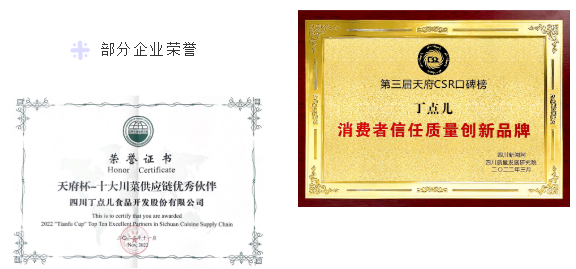 憑借企業(yè)出色的行業(yè)影響力和巨大的發(fā)展?jié)摿?,丁點(diǎn)兒股份先后獲得“中國(guó)餐飲供應(yīng)鏈TOP榜頭部品牌”、2022“天府杯”十大川菜供應(yīng)鏈優(yōu)秀伙伴、成都市安全文化建設(shè)示范單位、“消費(fèi)者信任質(zhì)量創(chuàng)新品牌”等眾多榮譽(yù)。