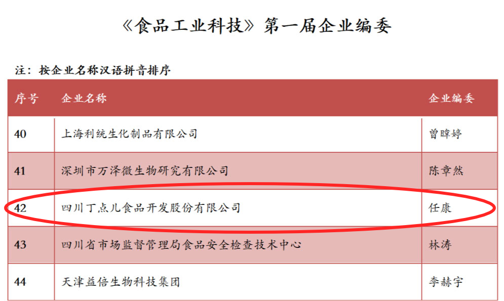 近日,中國權(quán)威學(xué)術(shù)期刊《食品工業(yè)科技》第一屆企業(yè)編委專家名單公布,四川丁點(diǎn)兒食品開發(fā)股份有限公司董事長任康成功當(dāng)選。