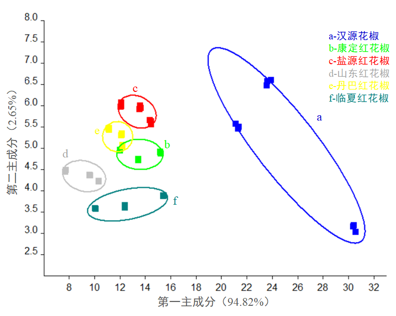 圖2:電子鼻傳感器對(duì)不同產(chǎn)地紅花椒響應(yīng)數(shù)據(jù)的PCA 得分圖