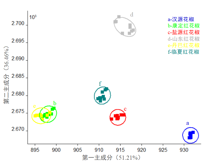 圖3:電子鼻傳感器對(duì)不同產(chǎn)地紅花椒響應(yīng)的 LDA 圖
