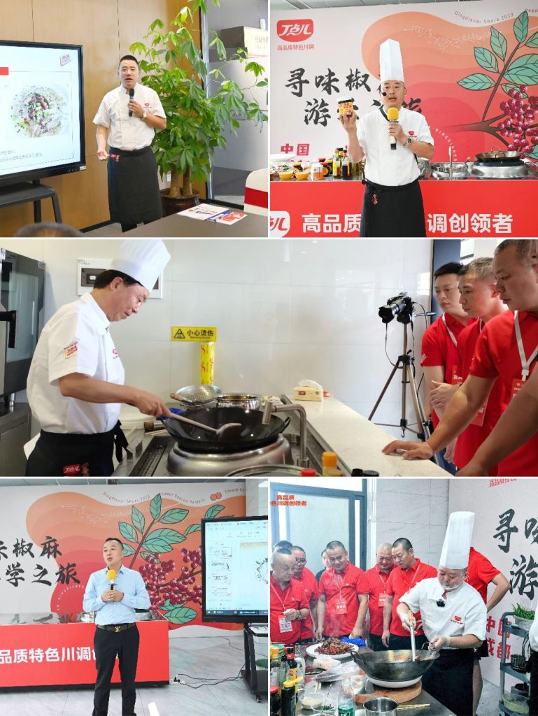 中國烹飪大師劉全剛、舒國重、劉凌峰、朱建中、曹曉軍等運用丁點兒干鍋醬、金湯酸菜醬、藤椒油、椒麻雞汁及麻得倒紅花椒油等產(chǎn)品現(xiàn)場演繹特色菜品,幫助大家深化產(chǎn)品理解和運用。大廚們以分組抽盲盒食材的形式進行菜品制作挑戰(zhàn),在實操中發(fā)掘丁點兒高品質(zhì)特色川調(diào)獨特的風味魅力。??