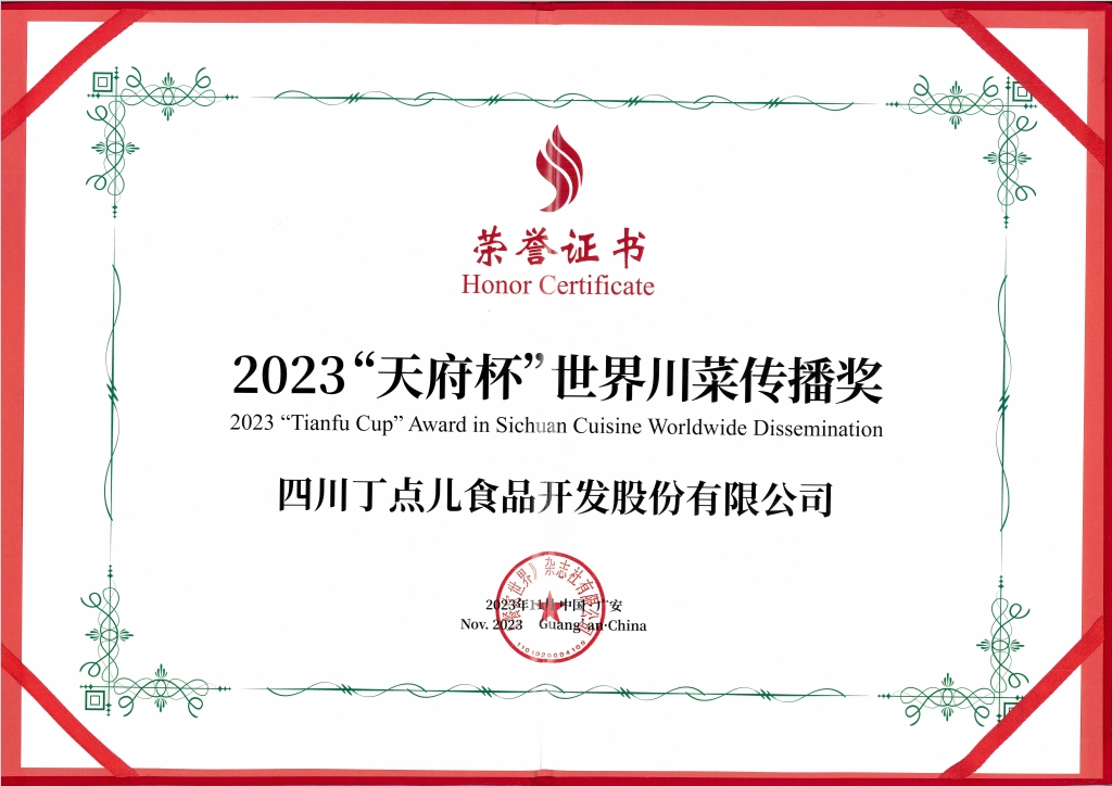 憑借出色的企業(yè)影響力和巨大的發(fā)展?jié)摿Γ↑c(diǎn)兒食品在這一年又?jǐn)孬@了多項(xiàng)榮譽(yù)?!澳甓瘸?jí)品牌之星”、2023“天府杯”世界川菜傳播獎(jiǎng)、第十一屆中國(guó)食材電商節(jié)-優(yōu)質(zhì)企業(yè)推薦等稱號(hào),充分展示了行業(yè)對(duì)丁點(diǎn)兒食品實(shí)力的肯定。