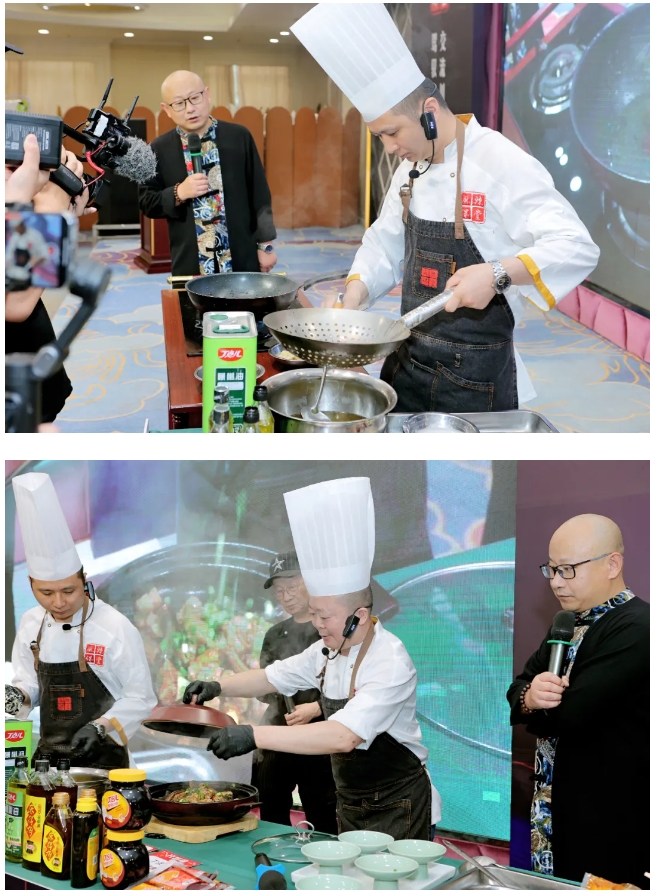 活動現(xiàn)場,羅成勇和劉全剛兩位大師通過盲盒形式分別抽取到丁點兒水煮醬、泡椒醬、麻得倒純萃花椒油等3款特色川調(diào)產(chǎn)品,現(xiàn)場烹飪制作了生烹脆鱔骨、新水煮脆滑嫩兔兩道菜品。