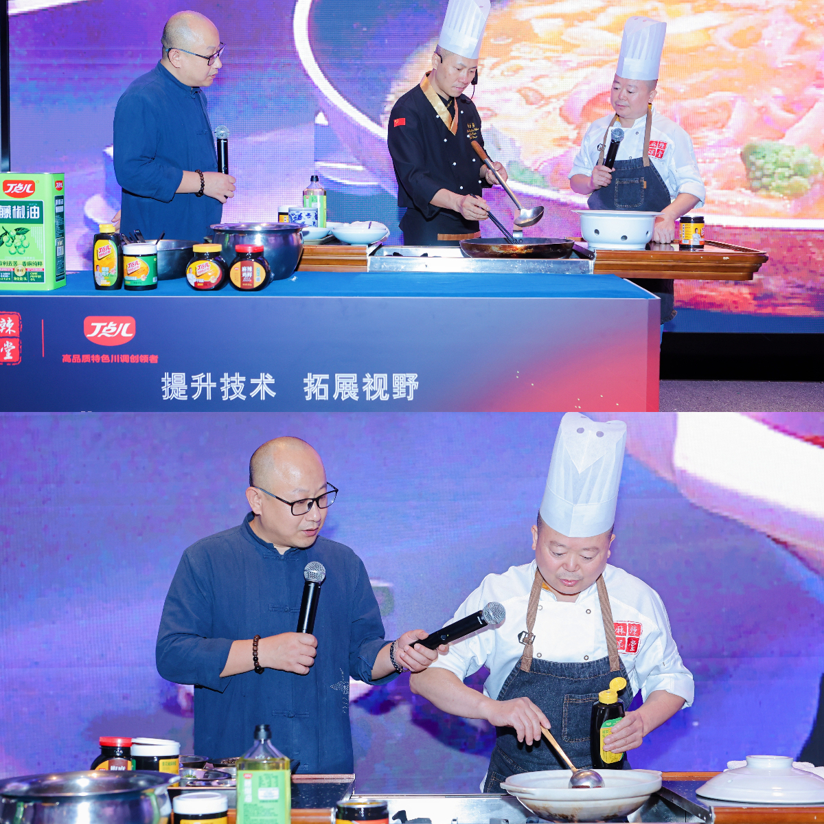 現(xiàn)場,中國烹飪大師崔國勇、劉全剛用丁點(diǎn)兒金湯酸菜醬、椒麻雞鮮、藤椒油等現(xiàn)場演繹了金湯酸菜手工面筋黃竹參、一品燒肉、風(fēng)味清香醬等特色菜品,還分享了自己的烹飪心得和技巧,讓參與者們受益匪淺。