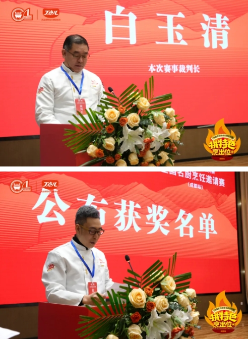 中國烹飪協(xié)會(huì)名廚專委會(huì)常務(wù)副主席、本次大賽裁判長白玉清作了賽事點(diǎn)評(píng);中國烹飪協(xié)會(huì)名廚專委會(huì)常務(wù)副主席、四川旅游學(xué)院教授、本次大賽監(jiān)審長蘭明路宣讀了金獎(jiǎng)前十名名單。