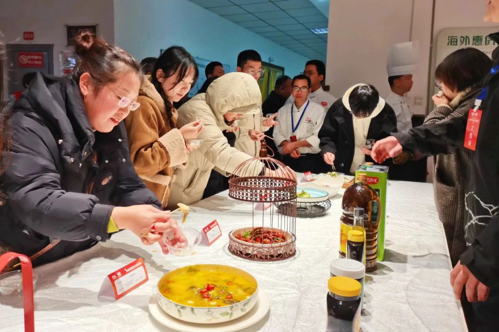 獨(dú)特的風(fēng)味、卓越的品質(zhì),丁點(diǎn)兒高品質(zhì)特色川調(diào)產(chǎn)品吸引了眾多參賽選手及現(xiàn)場嘉賓的目光。以其烹飪的干鍋醬香掌中寶、青椒毛血旺、金湯酸菜魚片等菜品更是香飄四溢,一上桌就被品鑒一空?!疤贸粤耍粔虺?,不盡興!”四川旅游學(xué)院一位志愿者同學(xué)說。