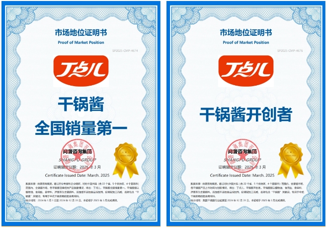 尚普咨詢集團是中國最早成立的專業(yè)市場研究公司之一。其通過行業(yè)專家和企業(yè)調(diào)研,對比中國大陸(含22個省、5個自治區(qū)、4個直轄市)范圍內(nèi),全渠道市場、各干鍋醬產(chǎn)品上市時間與創(chuàng)新情況,從我國干鍋醬行業(yè)起源統(tǒng)計至2024年12月31日,得出丁點兒為“干鍋醬開創(chuàng)者”的認證。同時根據(jù)全渠道市場,統(tǒng)計了2024年1月1日至2024年12月31日各干鍋醬品牌相關(guān)產(chǎn)品銷量情況,得出丁點兒“干鍋醬全國銷量第一”的認證。