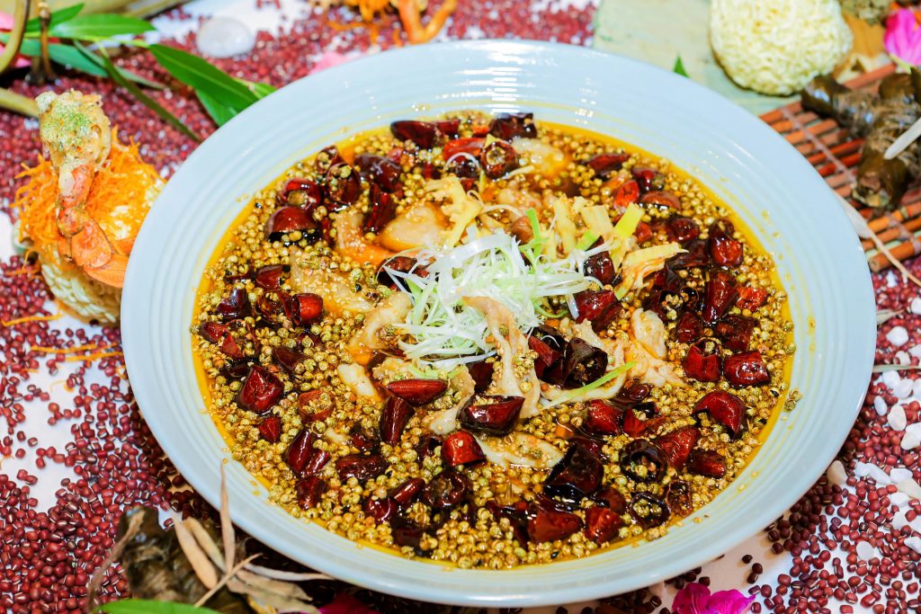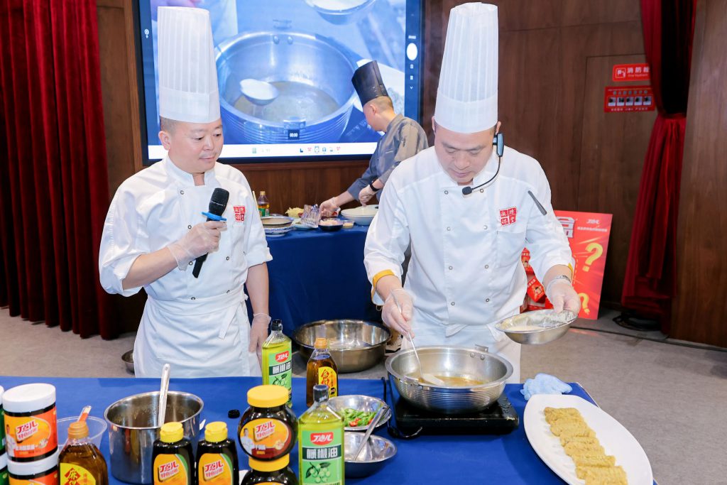 現(xiàn)場,行政總廚李偉、王俊成現(xiàn)場演繹經(jīng)典川菜創(chuàng)新烹飪技法。用丁點兒椒麻雞汁、藤椒油、青花椒麻辣醬等高品質(zhì)特色產(chǎn)品創(chuàng)新打造的紅袍尋雙味、清幽九肚魚等特色風(fēng)味菜品,將椒麻味型展現(xiàn)得淋漓盡致,香氣溢滿整個會場,引得與會嘉賓紛紛前來品鑒交流。