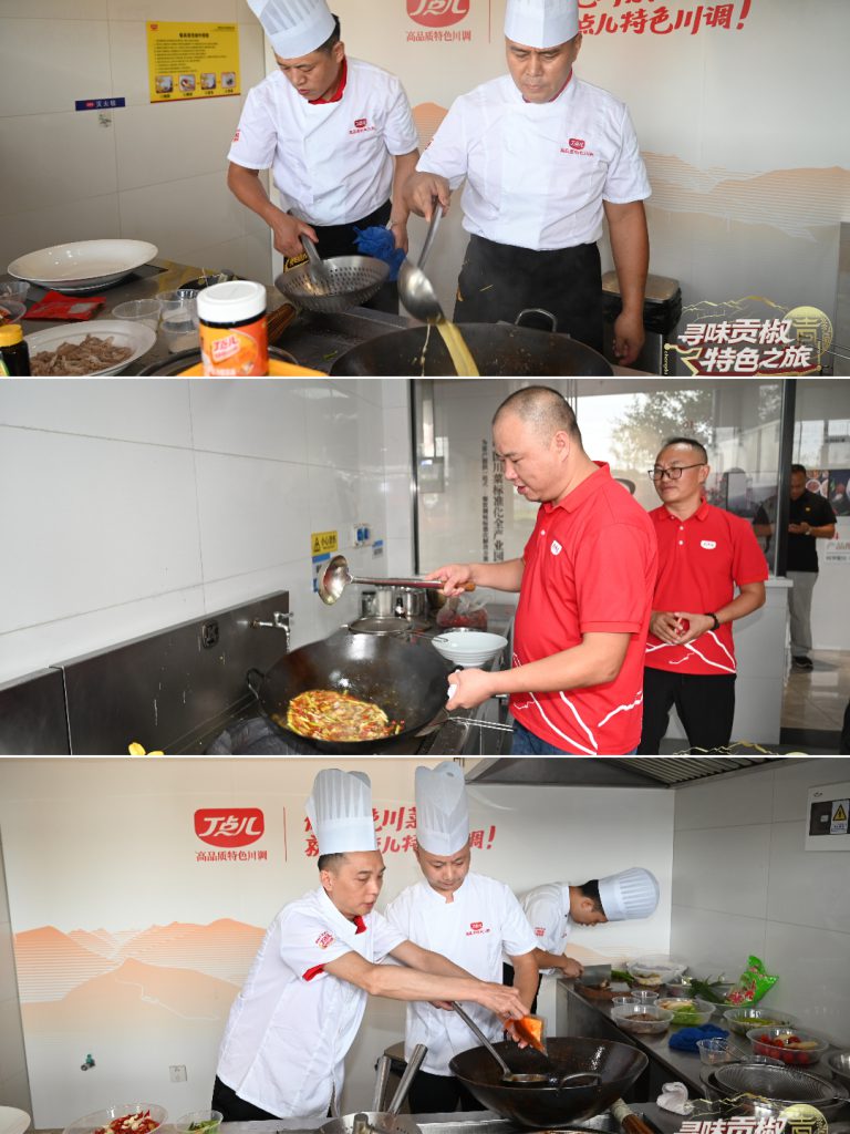 廚藝交流環(huán)節(jié),嘉賓們分組以椒麻、金湯酸菜、泡椒、干鍋四大風味為靈感,結(jié)合丁點兒椒麻雞汁、干鍋醬等即興創(chuàng)作佳肴?,F(xiàn)場香氣四溢,創(chuàng)意迭出。
